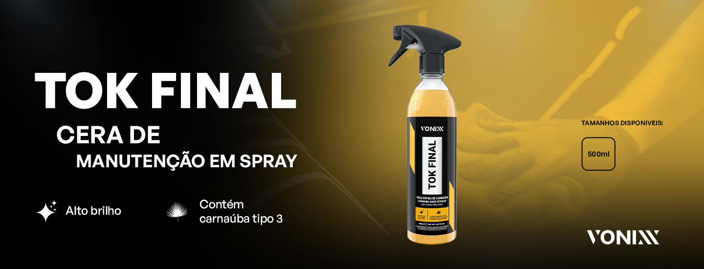 O Tok Final Vonixx é uma cera spray pronta para uso, desenvolvida com a mais pura carnaúba cearense e polímeros de última geração. Ideal para manutenção entre enceramentos, mantém a pintura do veículo sempre protegida e com brilho intenso.