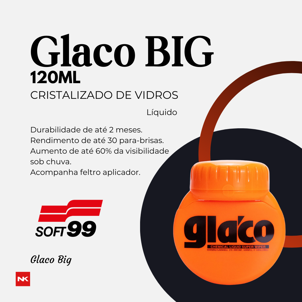 BIG GLACO é um cristalizador de vidros de alta performance. Sua fórmula cria uma película protetora que repele a água da chuva, melhora a visibilidade e aumenta a segurança. A partir de 45 km/h, as gotas deslizam rapidamente, reduzindo a necessidade do uso do limpador de para-brisa.