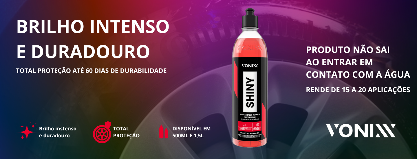 O Shiny Vonixx 500ml é o produto ideal para manter a beleza e brilho dos pneus do seu veículo. Sua fórmula exclusiva protege e revitaliza a borracha, garantindo brilho intenso e duradouro, sem necessidade de esforço físico.